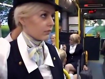 Huge-boobed stewardess gives hand-job on bus, takes cumshot