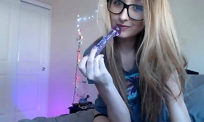 Platinum-blonde with glasses plays with her pussy