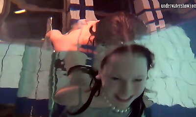 Two beautiful girls swimming naked in a pool
